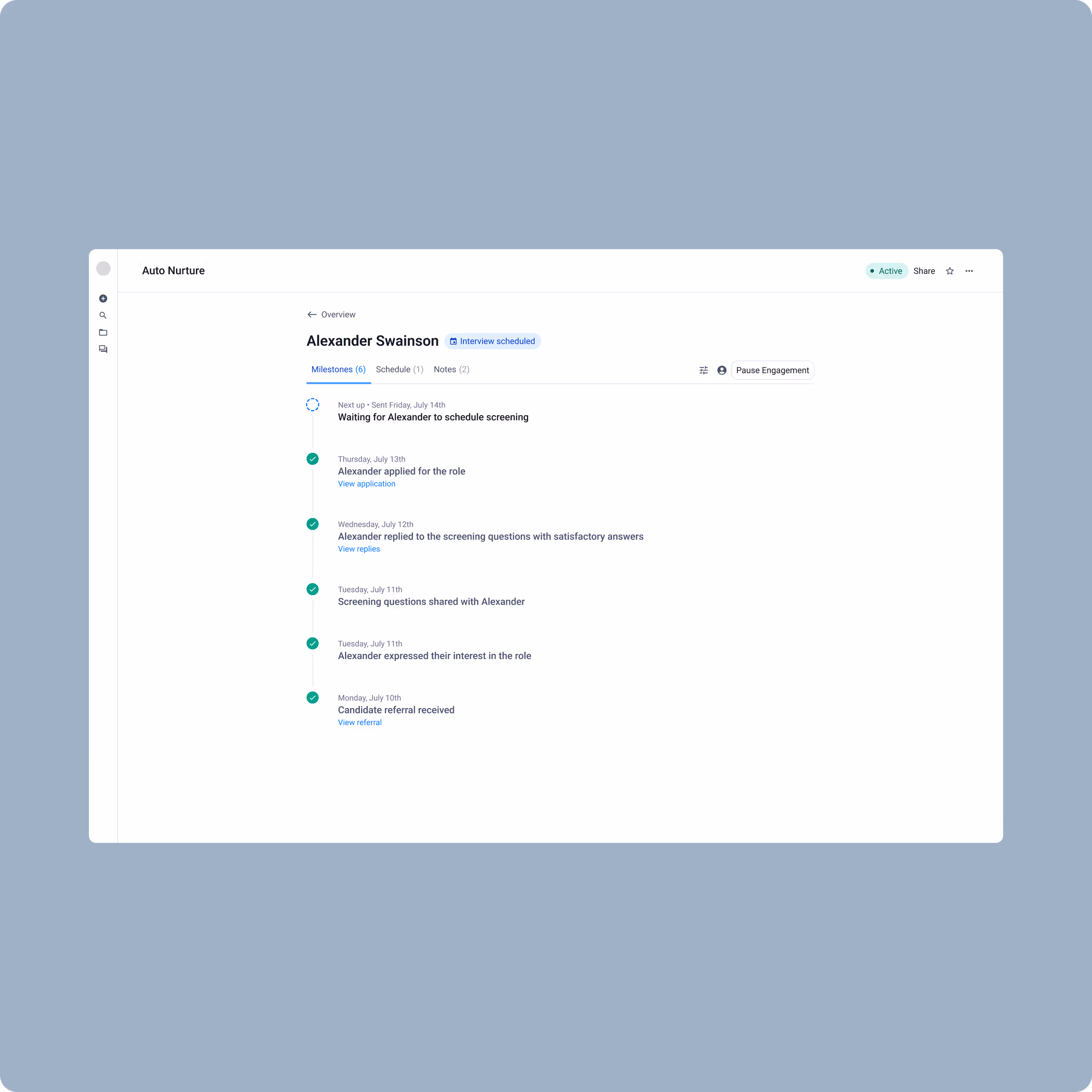 I led the design of Cleo, an agentic talent nurture system that works continuously in the background to build candidate relationships. The goal was to create an AI teammate that feels collaborative rather than automated—one that handles repetitive outreach while keeping Talent Marketers in control of strategic decisions and high-touch conversations.
